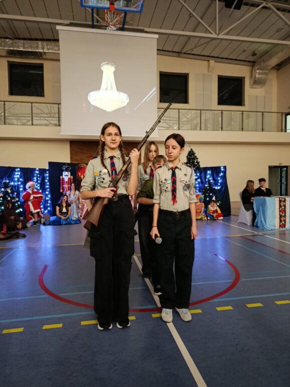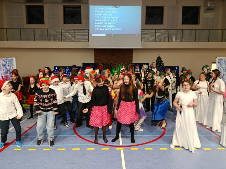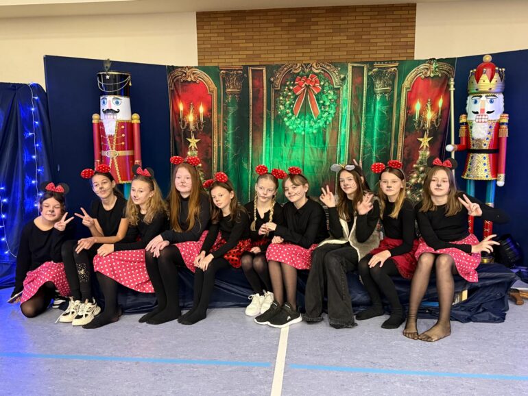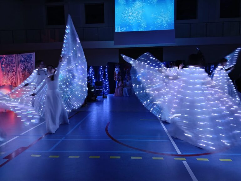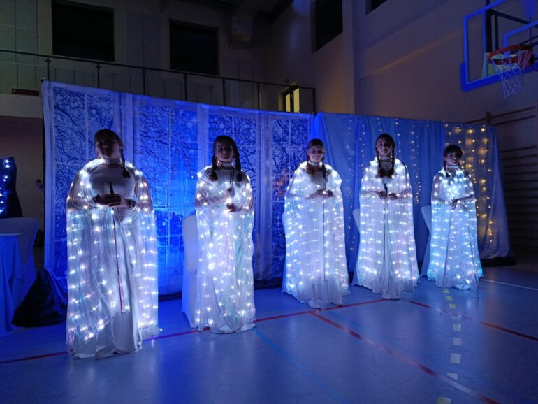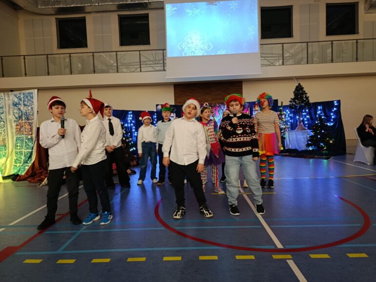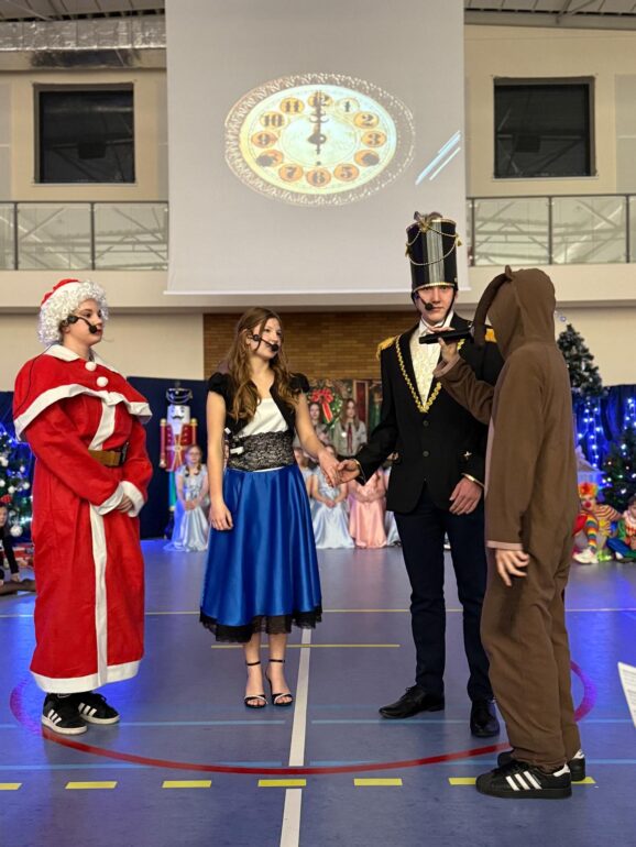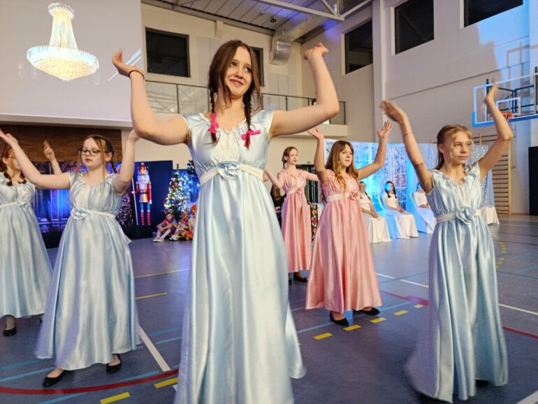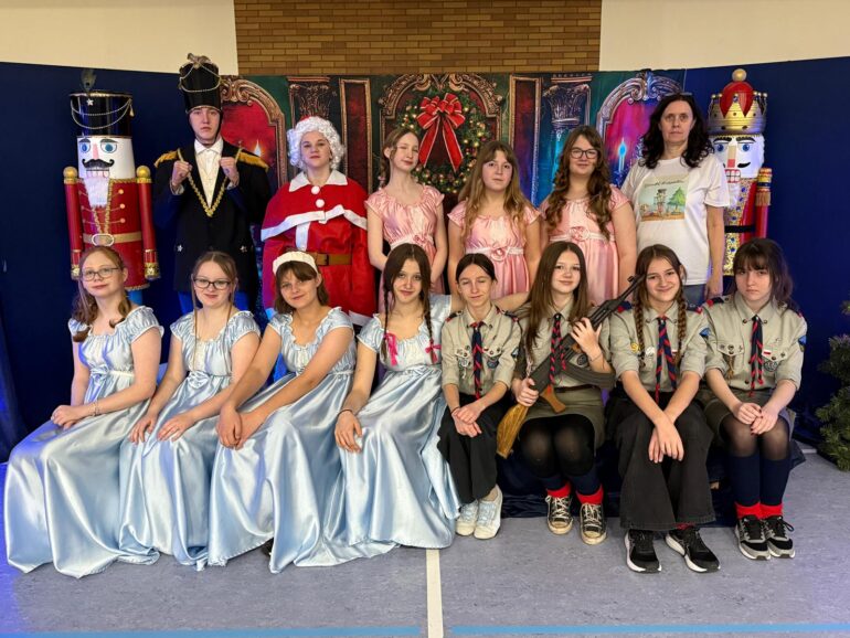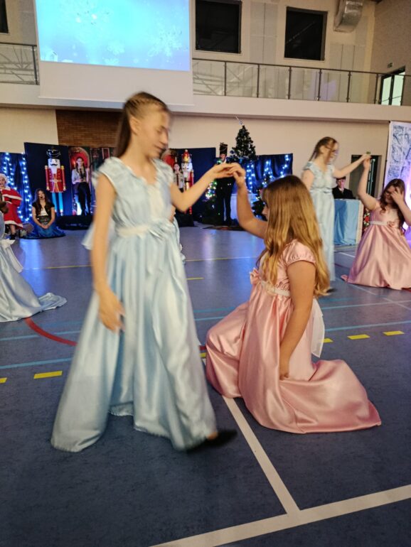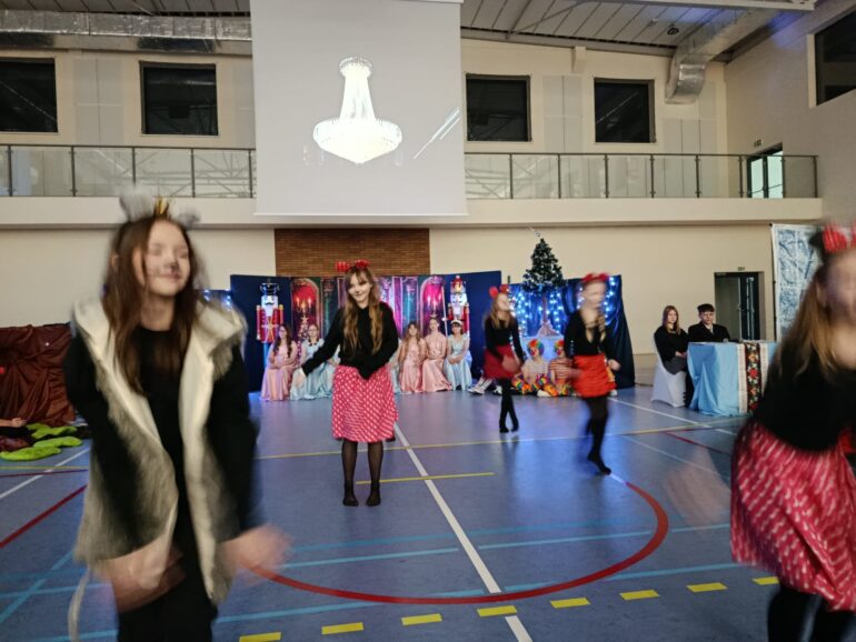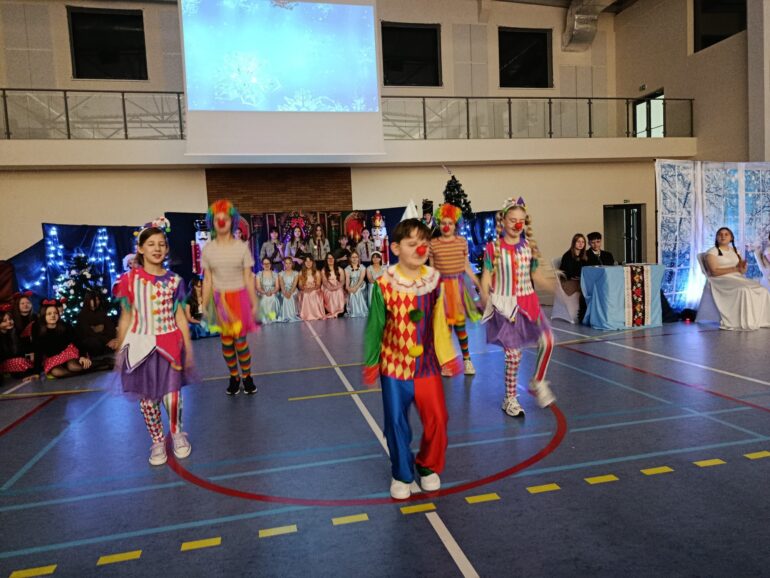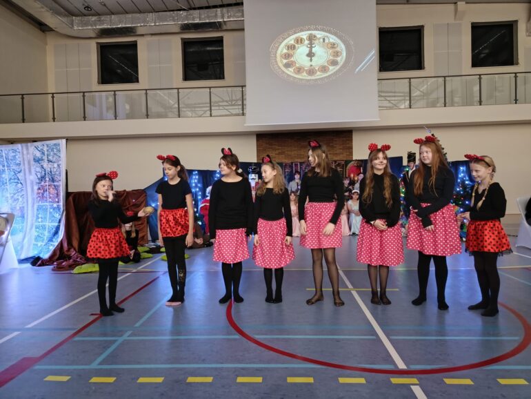 Tym razem uczniowie klas 4a, 4b, 5a, 7b oraz 8b spróbowali przenieść widzów w świat pełen magii i uroku zbliżających się Świąt Bożego Narodzenia. Przedstawienie zainspirowane utworem E.T.A Hoffmanna pt. “Dziadek do orzechów” to spektakl słowno – muzyczny. Widzowie mogli ujrzeć zarówno tańczące, jak i śpiewające zabawki, mieli okazję towarzyszyć bohaterom w przygodach, które przeżywali. Niezwykłości całemu przedsięwzięciu dodawały piękne stroje przygotowane przez rodziców i nauczycieli: śnieżynki w świetlistych pelerynach, kolorowe pajacyki, zwiewne i urocze laleczki czy też poważni żołnierze, aż po rolę główne, wyciągnięte niczym z baśni- Klarę i Dziadka do orzechów.