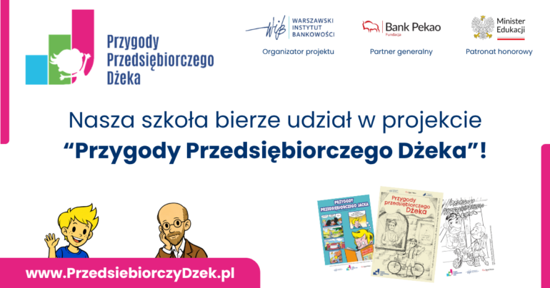Nasza szkoła bierze udział w projekcie „Przygody Przedsiębiorczego Dżeka” – programie edukacyjnym, w którym uczniowie poznają świat ekonomii i finansów razem z Dżekiem – bohaterem, który krok po kroku pokazuje im, jak podejmować decyzje, planować i radzić sobie z wyzwaniami.